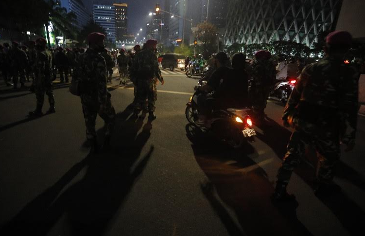 Merahputih.com - Massa aksi tolak UU Omnibus Law Cipta Kerja sudah mulai membubarkan Patung Kuda Arjuna Wiwaha, Jakarta Pusat pada Selasa (20/10) sekitar pukul 17.51 WIB. Massa digiring oleh anggota Marinir untuk membubarkan diri mengantisipasi kerusuhan.