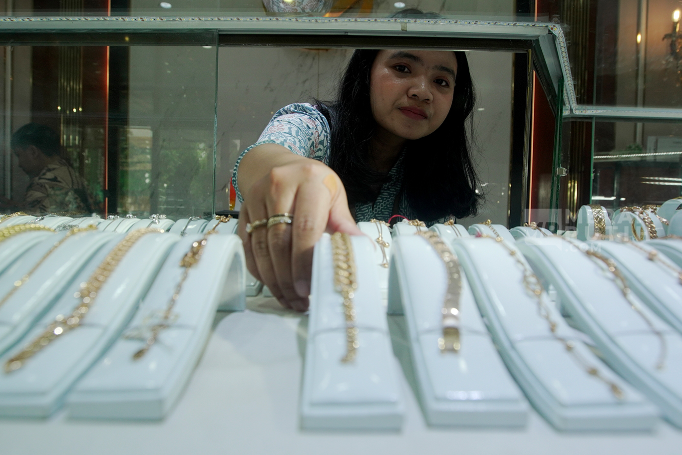Hari ini 10 Oktober 2025 mengalami penurunan dibandingkan harga kemarin. Di Rajaemas, harga emas perhiasan 24 karat dijual Rp2.065.000 per gramnya, turun dari harga kemarin Rp2.085.000 per gram. (MP/Didik Setiawan).