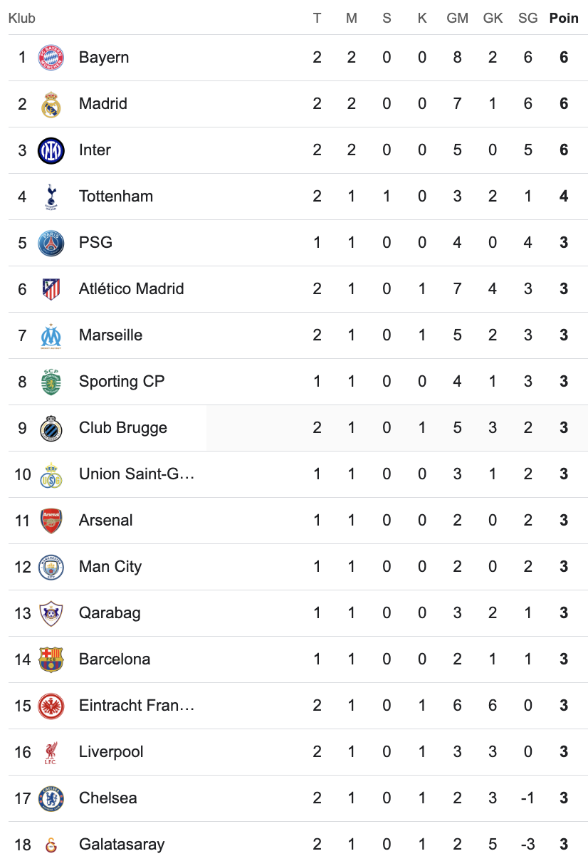 Kemenangan membuat Bayern Munchen semetara memimpin klasemen dengan enam poin. Jumlah ppin sama dengan Real Madrid dan Inter Milan, yang membuntuti di tempat kedua dan ketiga.