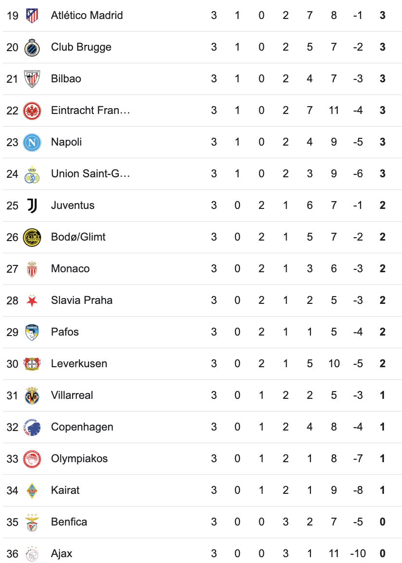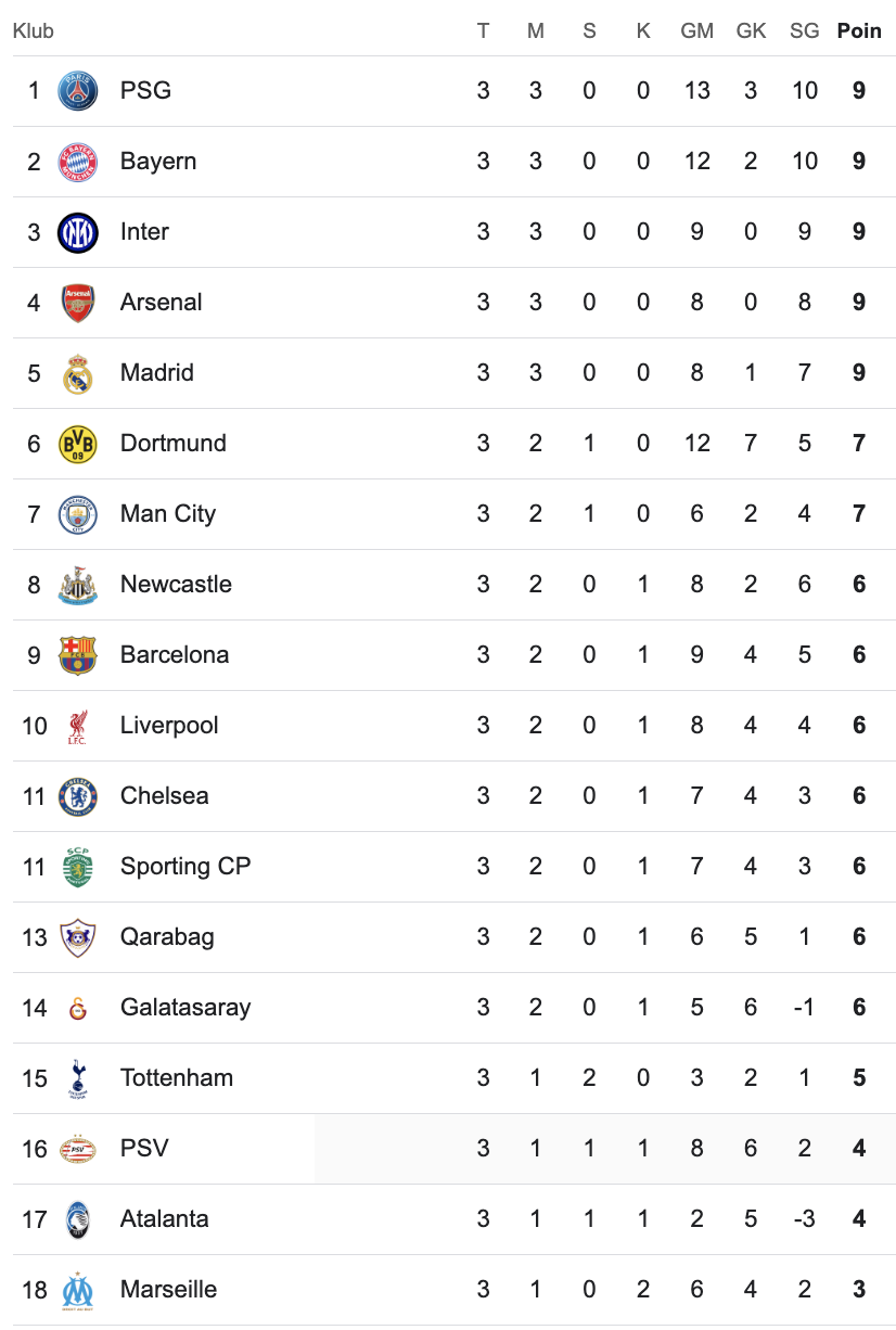 Sementara itu, Real Madrid mengalahkan Juventus lewat gol tunggal Jude Bellingham (57’). Real Madrid kini berada di posisi 5 dengan sembilan poin.