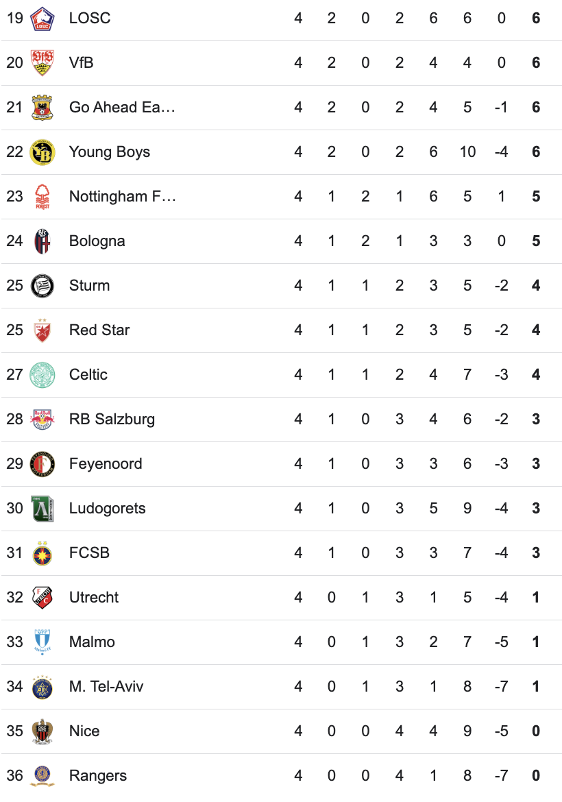 Kemenangan juga diperoleh FC Basel, Red Star (Crvena zvezda), RB Salzburg, Celta Vigo, Panathinaikos, Nottingham Forest, PAOK, Aston Villa, VfB Stuttgart di matchday 4.