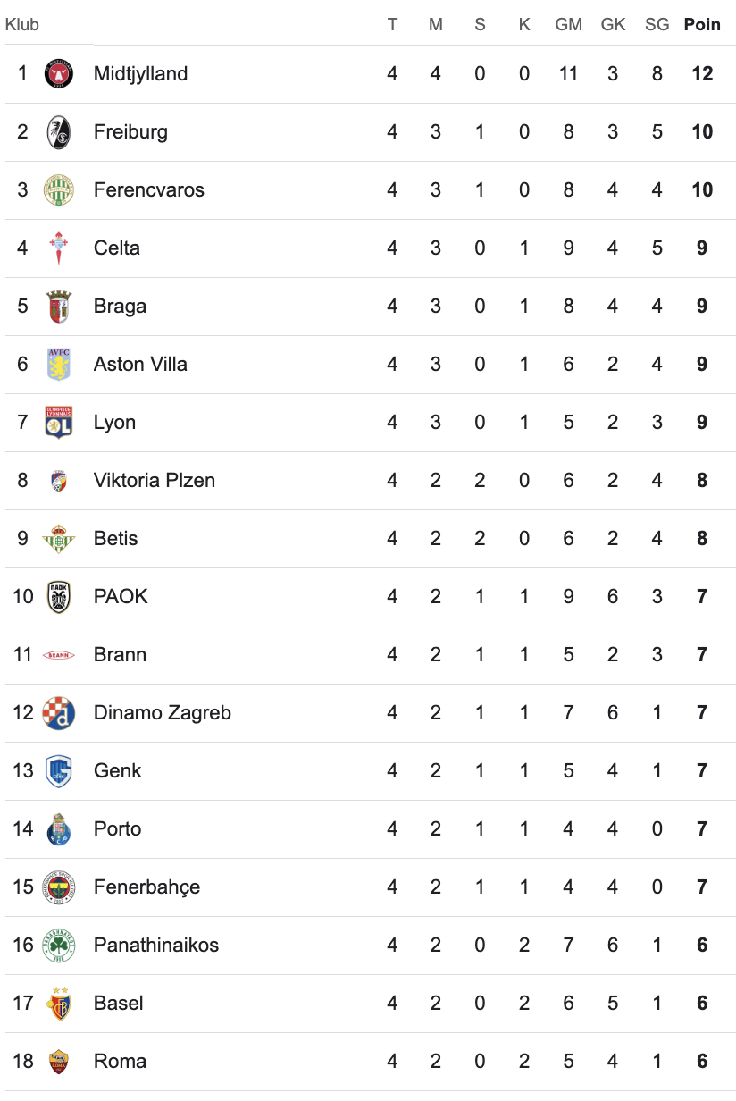 Kemenangan membuat Midtjylland mengoleksi 12 poin dari empat laga. Unggul dua poin dari Freiburg dan Ferencvaros.