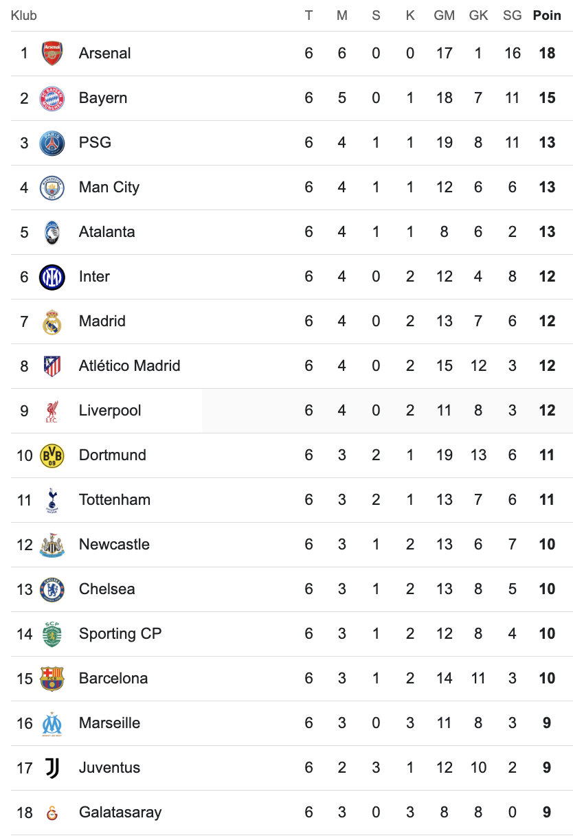 Klasemen Liga Champions Terbaru Usai Arsenal Cukur Club Brugge dan Real Madrid Terjungkal di Kandang Sendiri