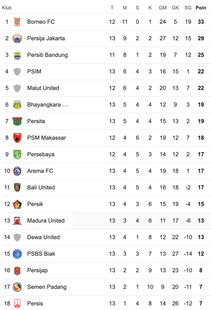 Meski kalah, Borneo FC masih aman di posisi puncak. Pesut Etam ada di posisi pertama dengan 33 poin, berselisih empat poin dari Persija yang membuntuti di tempat kedua.