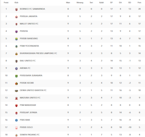 Di sisi lain tabel, posisi tiga terbawah ditempati oleh PSBS Biak dengan 6 poin, disusul Persis Solo dengan lima poin. Semen Padang menempati juru kunci klasemen sementara dengan hanya mengumpulkan empat poin.