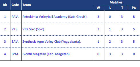Sementara itu, Petrokimia Volleyball Academy (Kab. Gresik) juga masih menjadi pemuncak klasemen dengan perolehan 8 poin. Kemudian, Vita Solo (Solo) dan Synthesis Agro Volley Club (Yogyakarta) sama-sama memiliki 5 poin di posisi kedua dan ketiga. Terakhir, ada Ivontri Magetan (Kab. Magetan) dengan perolehan 0 poin.