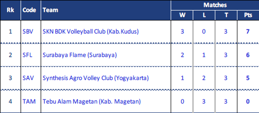 Hasil pertandingan tersebut pun membuat SKN BDK Volleyball Club (Kab. Kudus) masih bertengger di puncak klasemen dengan perolehan 7 poin. Lalu, diikuti oleh Surabaya Flame (Surabaya) dengan 6 poin, Synthesis Agro Volley Club (Yogyakarta) 5 poin, dan Tebu Alam Magetan (Kab. Magetan) 0 poin.