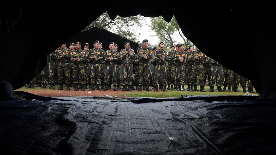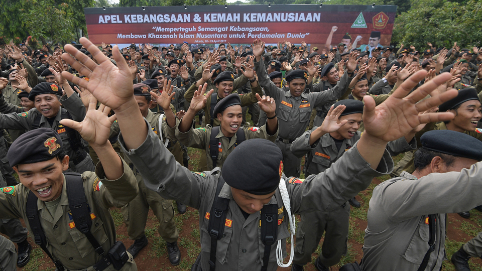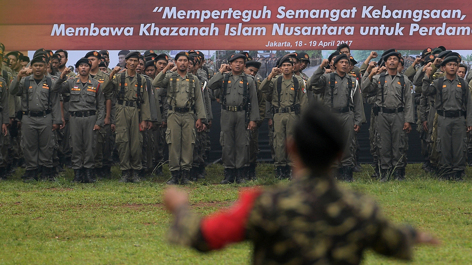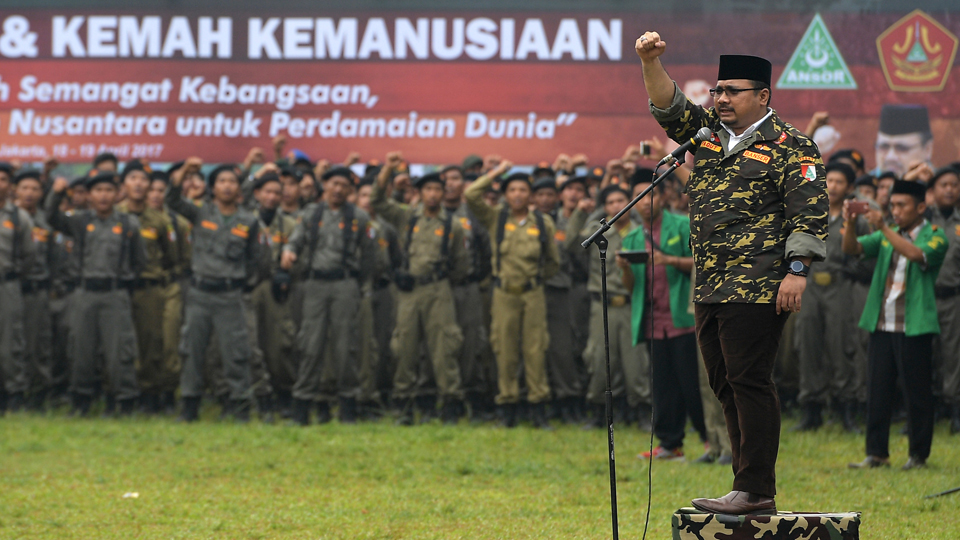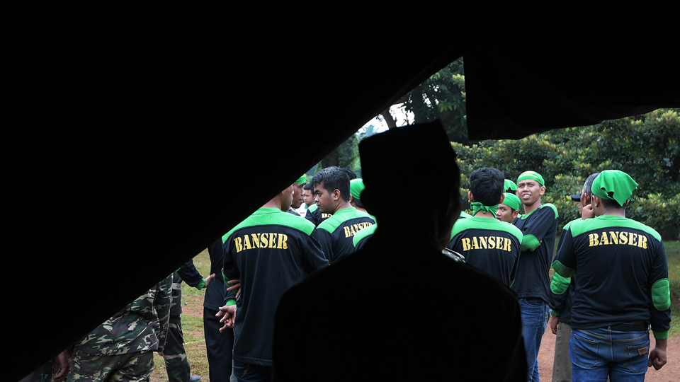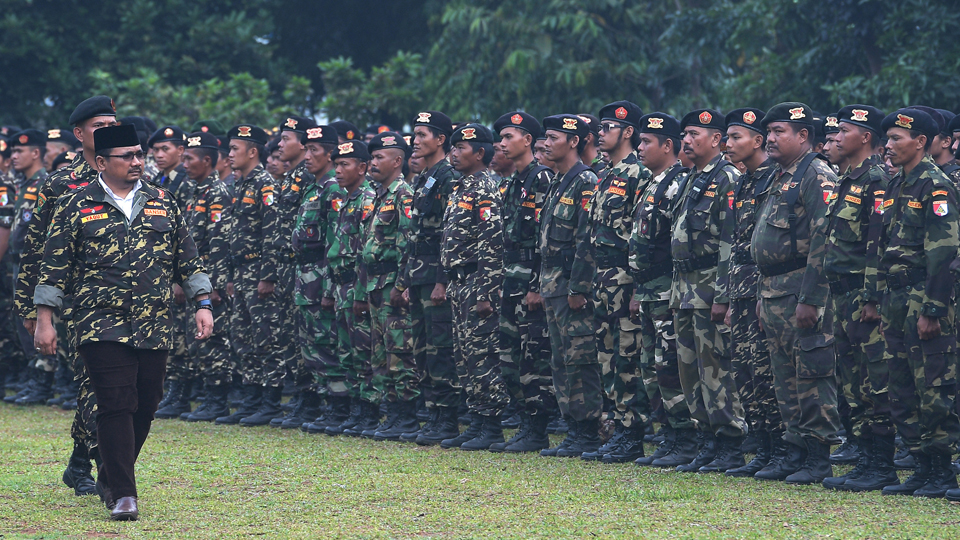 Anggota Barisan Ansor Serbaguna (Banser) Nahdlatul Ulama bersiap mengikuti Apel Kebangsaan dan Kemah Kemanusiaan di Bumi Perkemahan Ragunan, Jakarta Selatan, Selasa (18/4). Kegiatan dalam rangka hari lahir ke-83 GP Ansor tersebut mengangkat tema Memperteguh Semangat Kebangsaan, Membawa Khazanah Islam Nusantara untuk Perdamaian Dunia. ANTARA FOTO/Sigid Kurniawan