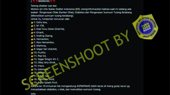Klaim IDI mengumumkan adanya wabah pengerasan otak, diabetes dan pengerasan sumsum tulang belakang serta melarang mengkonsumsi 19 produk minuman adalah tidak benar.
