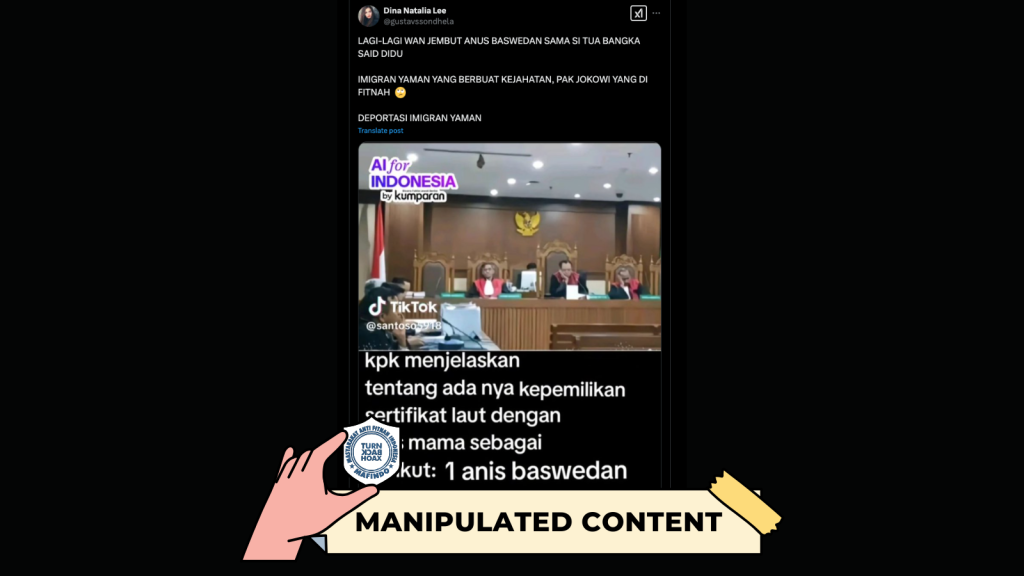 Informasi itu diunggah akun X “gustavssondhela” dengan klaim KPK menjelaskan bahwa terdapat sertifikat kepemilikan laut atas nama Anies Baswedan dan Said Didu. Dalam unggahannya, gambar mencantumkan logo media Kumparan.