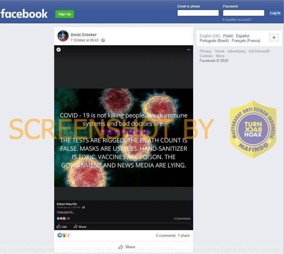 MerahPutih.com - Beredar postingan dari akun Facebook Doral Crocker screenshot berisikan klaim bahwa COVID-19 tidak menyebabkan orang meninggal dunia. Postingan ini diposting pada 7 Oktober 2020 dan dikomentari sebanyak 5 kali.
