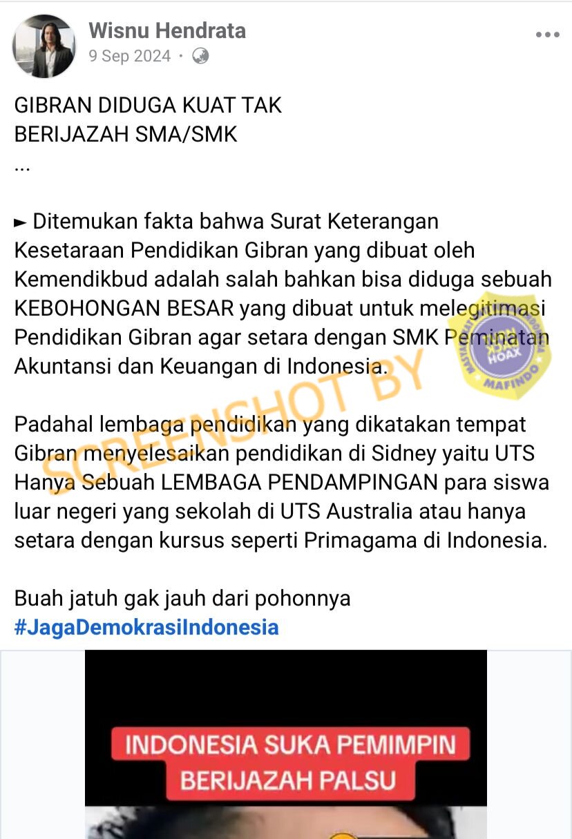 Berdasarkan penelusuran fakta informasi yang disebarluaskan akun Facebook bernama Wisnu Hendrata tidak benar alias hoaks. Kemendikbud sudah menjelaskan Gibran telah menempuh riwayat pendidikan yang setara dengan SMA di University of Technology Sydney (UTS) Insearch di Sydney, Australia pada tahun 2006. (Knu)