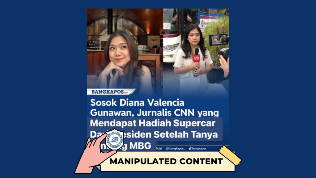 Unggahan berisi klaim “jurnalis CNN dapat hadiah supercar dari Prabowo setelah tanya tentang MBG” merupakan konten yang dimanipulasi. (Knu)
