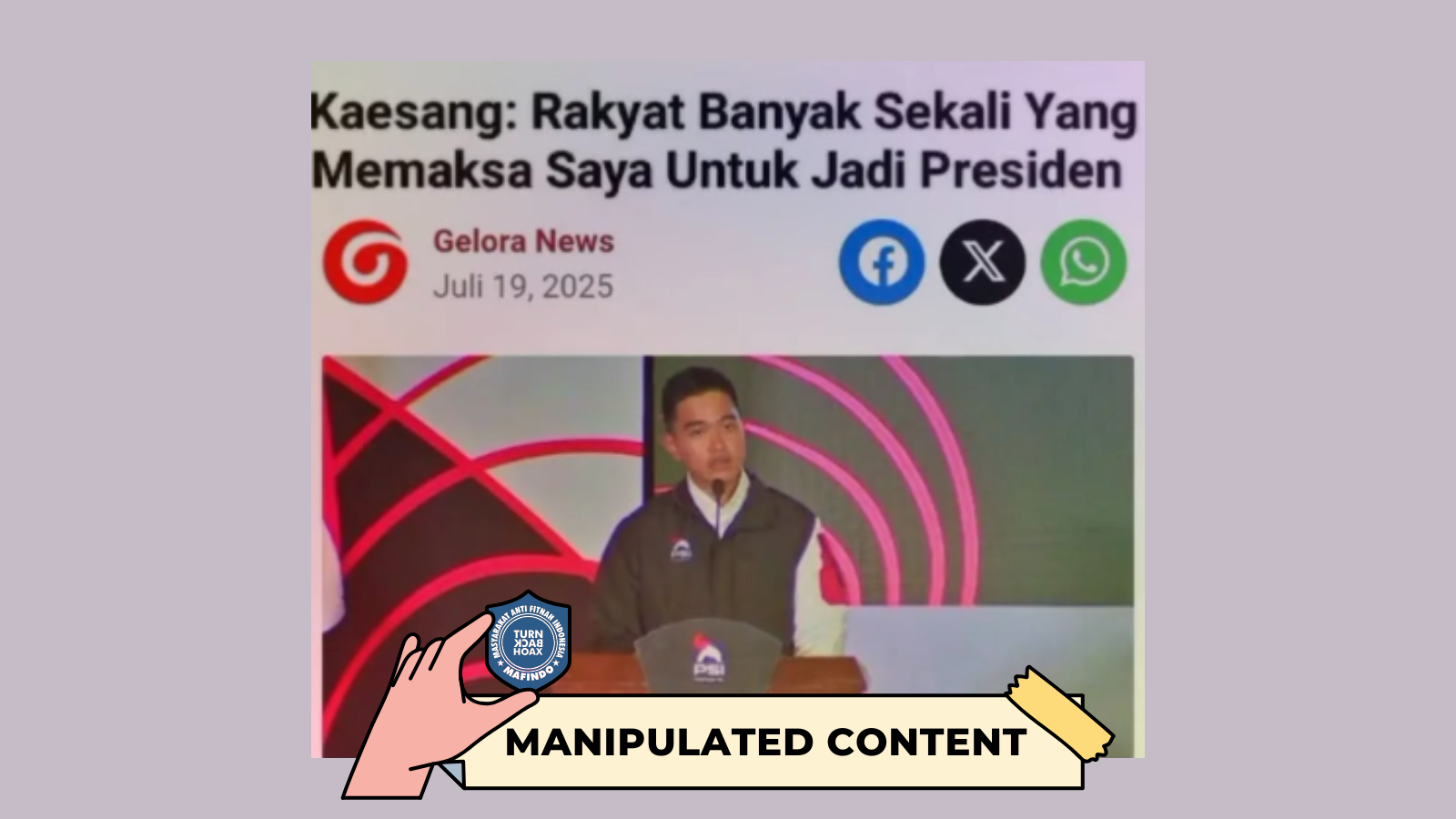 Unggahan berisi klaim judul artikel Gelora “Kaesang: Rakyat Banyak Sekali Yang Memaksa Saya Untuk Jadi Presiden” merupakan konten yang dimanipulasi. (Knu)