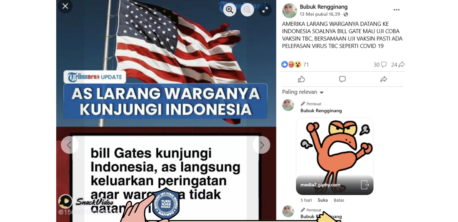 Unggahan berisi klaim “AS larang warga negaranya ke Indonesia karena ada uji coba vaksin TBC dari Bill Gates” merupakan konten yang menyesatkan. (Knu)