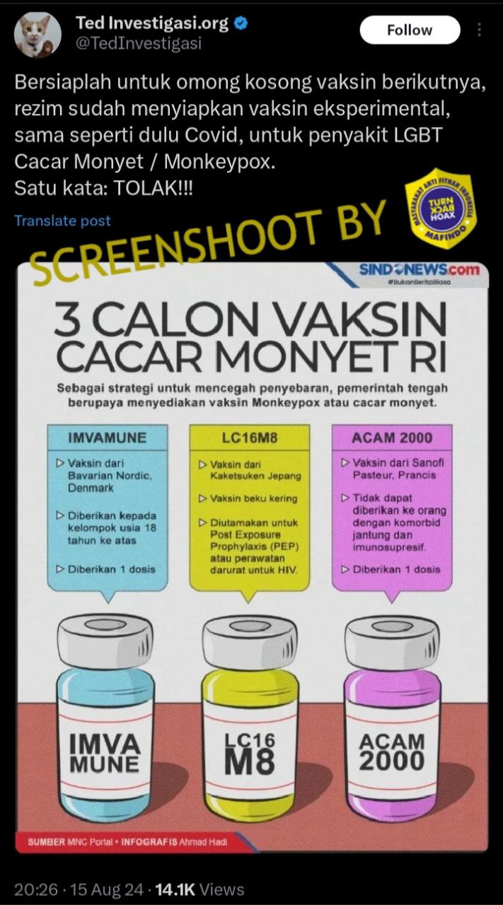 Setelah dilakukan penelusuran oleh tim AFP, informasi tersebut adalah hoaks. WHO pernah membahas mengenai kandungan ketiga vaksin tersebut (Imvamune, LC16M8, dan ACAM 2000) dan mempublikasikan dokumen resminya pada 23 Agustus 2024.