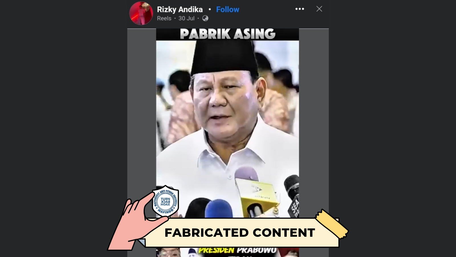 Unggahan video berisi klaim “Prabowo bakal ambil alih pabrik asing di Indonesia” adalah konten palsu. (Knu)