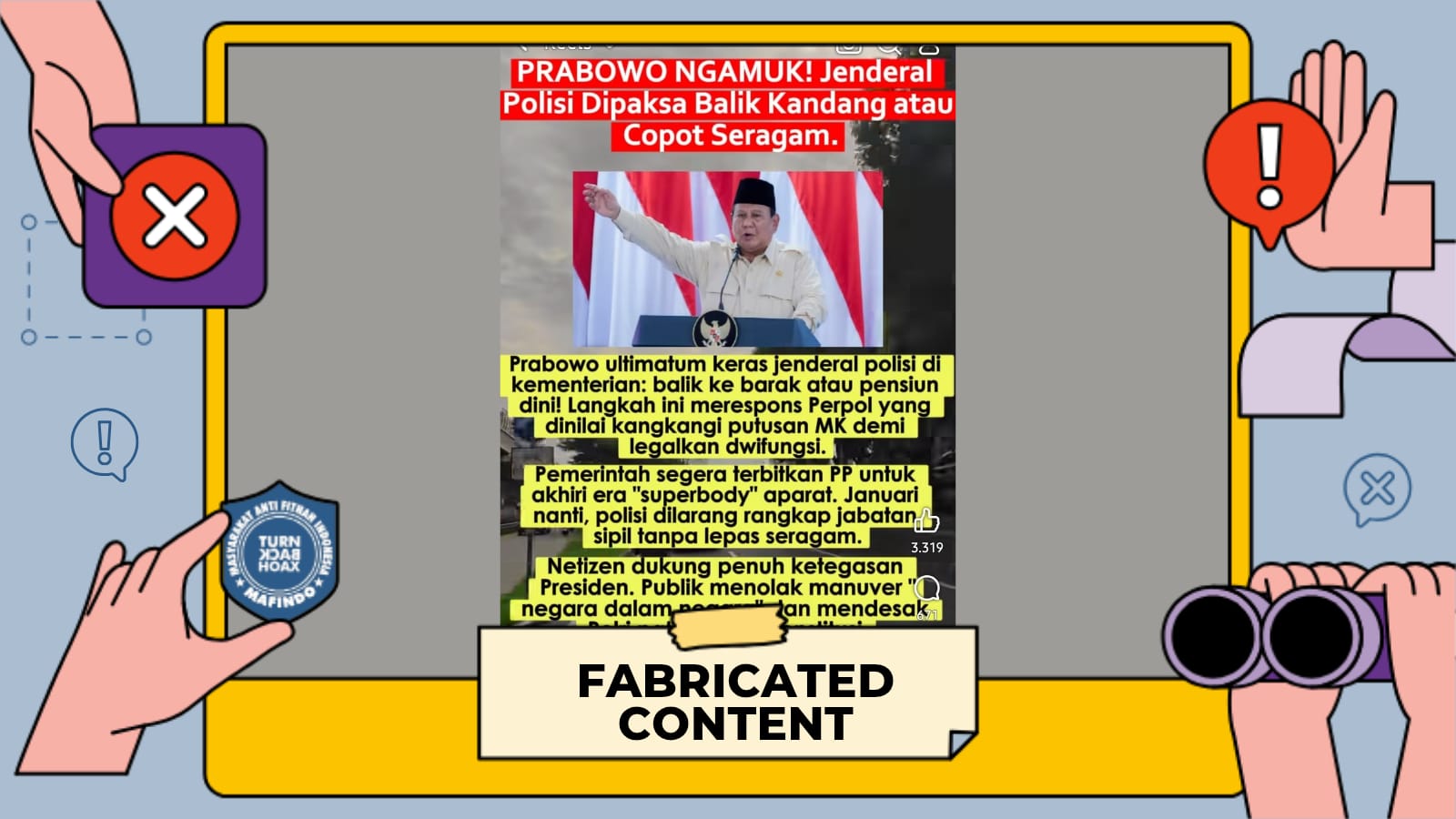 Tidak ditemukan informasi kredibel yang membenarkan klaim. Jadi, Unggahan berisi klaim “Prabowo ultimatum Jenderal Polisi di Kementerian: balik ke barak atau pensiun dini” merupakan konten palsu. (Knu)