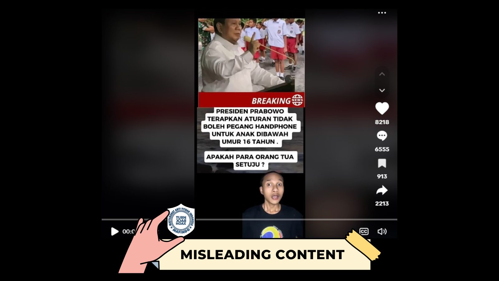 Video berisi klaim “Presiden Prabowo terapkan aturan anak di bawah 16 tahun tidak boleh pegang handphone” merupakan konten yang menyesatkan.