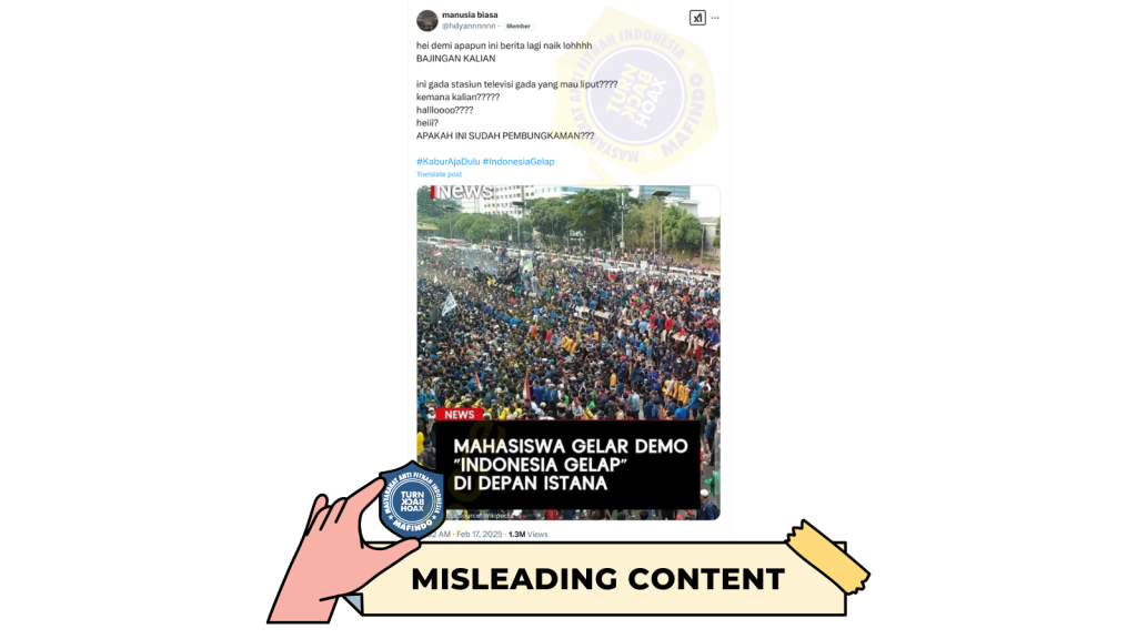 Faktanya berdasarkan hasil pencarian ada beberapa stasiun televisi dan media nasional yang melaksanakan liputan Demo Indonesia Gelap. Unggahan atau cuitan yang membagikan video tersebut masuk ke kategori konten yang menyesatkan. (Knu)
