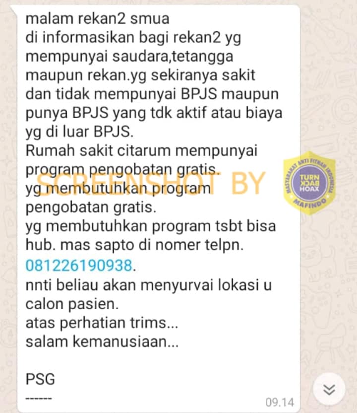Dalam broadcast itu menyampaikan bagi warga yang sedang sakit tidak memiliki kartu BPJS maupun BPJS yang tidak aktif, RS Citarum menerima dengan bayaran cuma-cuma dengan program pengobatan gratis.