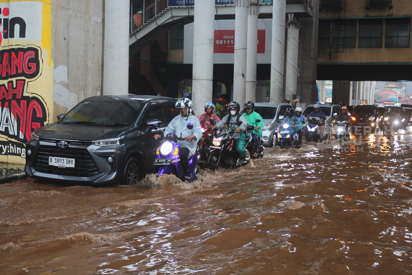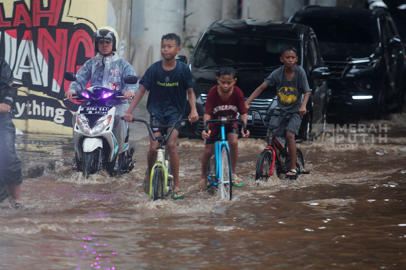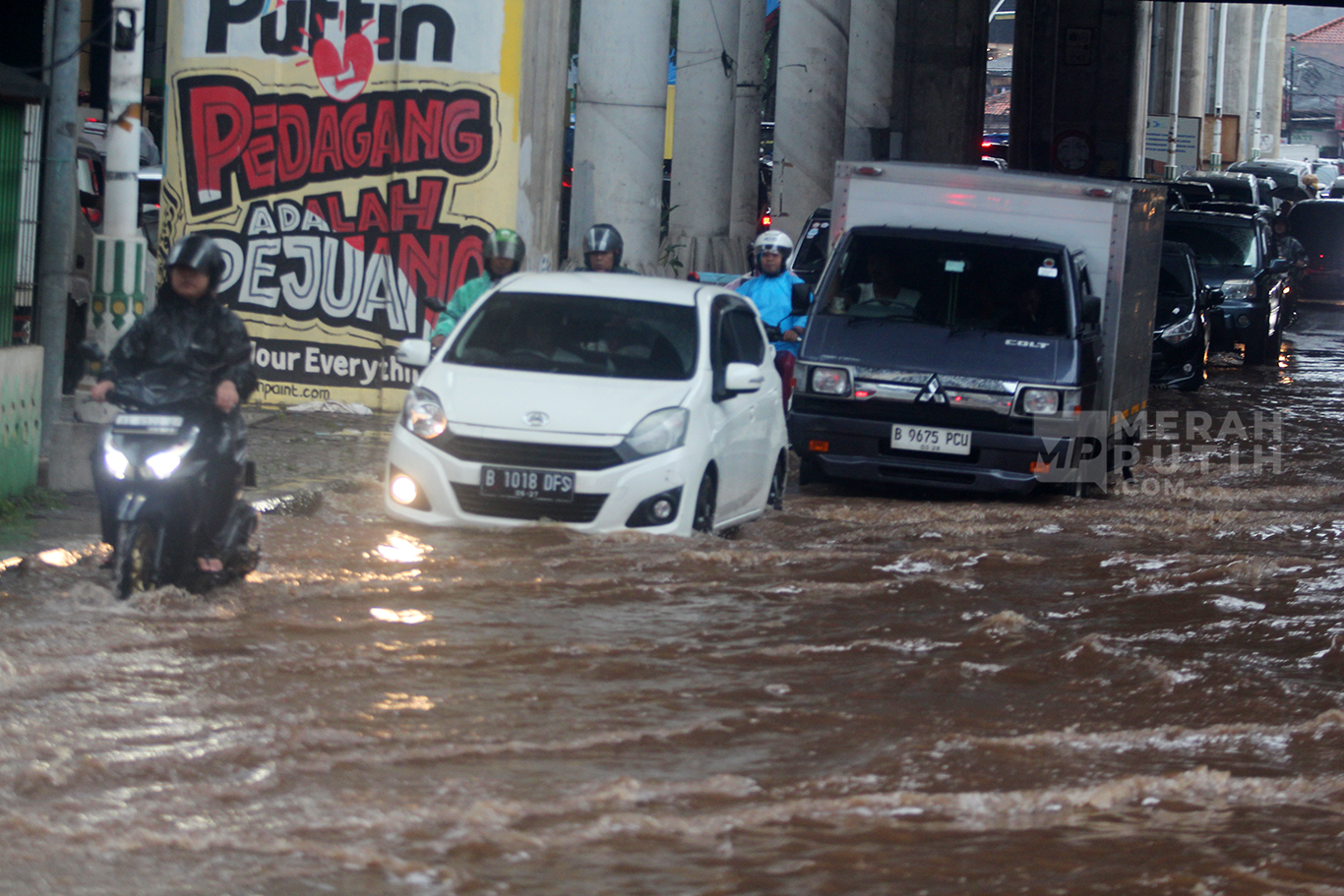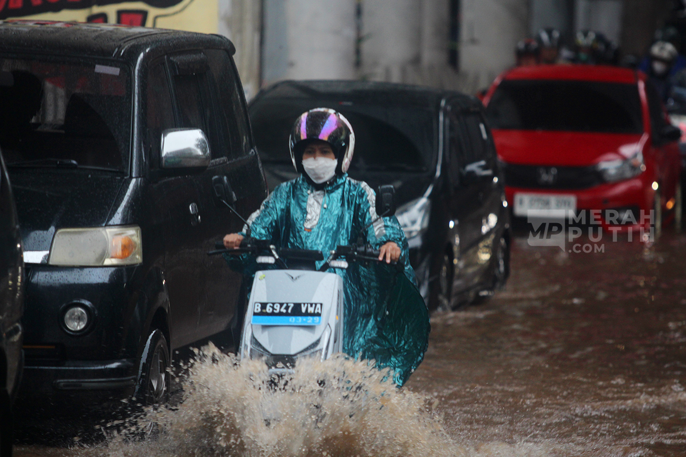 MerahPutih.com- Sejumlah kendaraan menerobos banjir setinggi 50 cm di Kawasan CIpulir, Jakarta Selatan, Sabtu (6/7/2024). Banjir merendam Jalan Ciledug Raya, tepatnya di kawasan Pasar Cipulir, Jakarta Selatan. Banjir dengan ketinggian 30-50 cm memenuhi jalan dan memaksa kendaraan bermoot melintas di jalan yg masih bisa dilewati kendaraan.