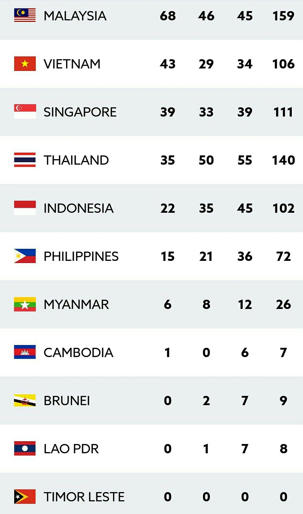 Malaysia yang memuncaki klasemen medali dengan mengumpulkan 67 emas, 45 perak dan 45 perunggu, masih dibuntuti Vietnam di posisi kedua dengan 44 emas, 29 perak dan 33 perunggu.