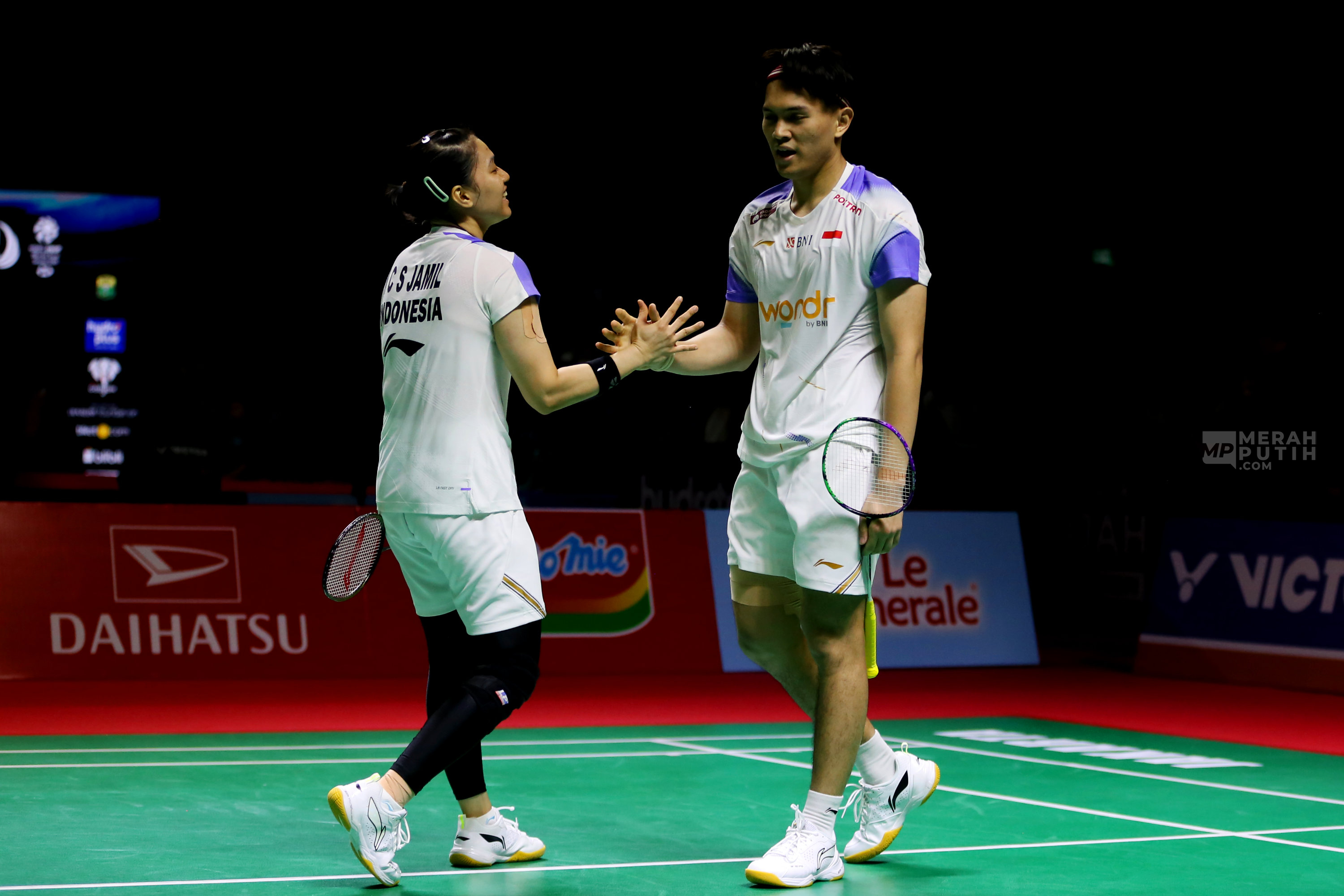 Ganda campuran bulu tangkis Indonesia Adnan Maulana/Indah Cahya Sari Jamil berhasil mengalahkan ganda Malaysia Goh Soon Huat/Lai Shevin Jemie dalam laga Babak 1 turnamen Indonesia Masters 2026. Adnan/Indah menang lewat drama rubber game dengan skor 18-21, 21-18, dan 22-20. Kemenangan ini membawa Adnan/Indah melaju ke babak 16 Besar Indonesia Masters 2026. (Foto: MP/Didik Setiawan).