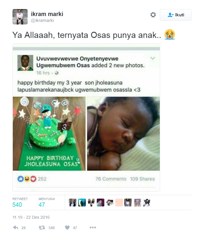 Masih ingat dengan seorang pria yang memiliki nama tersulit di dunia? Yups, siapa lagi kalau bukan Uvuvwevwevwe Onyetenyevwe Ugwemubwem Osas. Nah, seorang netizen di akun twitter @ikamarki iseng mengunggah sebuah capture dari facebook Osas.