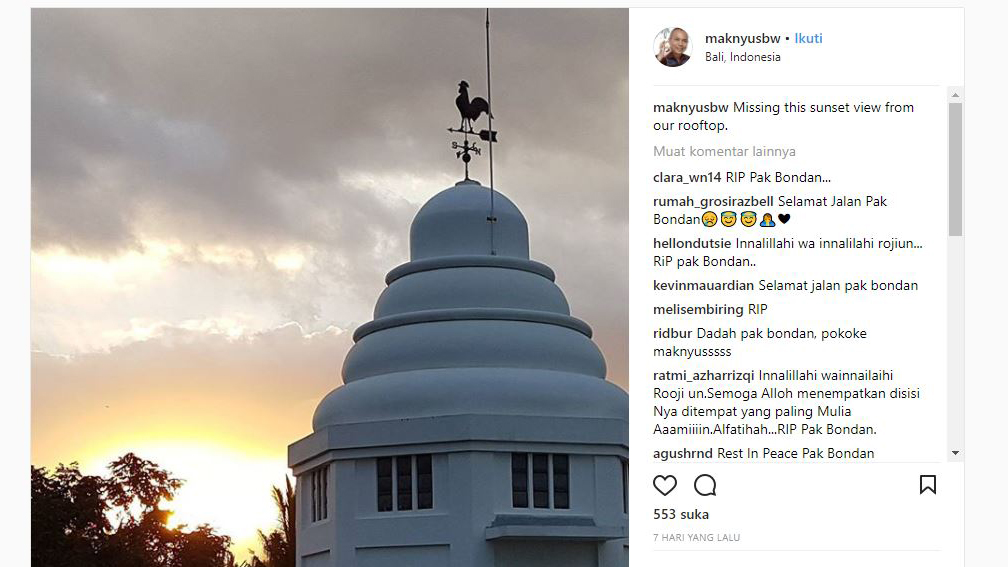 Sekitar tujuh hari sebelum meninggal, Bondan Winarno memposting foto atap bangunan yang tampak seperti bangunan tua berwarna putih. Dalam captionnya dia menulis, "Missing this sunset view from our rooftop." Tercantum dalam postingan tersebut lokasinya berada di Bali.
