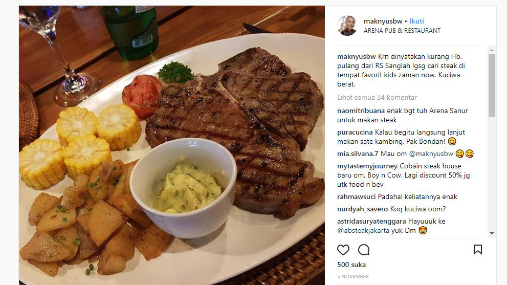 Nah, dipostingan pada tanggal 5 November silam, Bondan Winarno mengungkapkan bahwa dirinya dinyatakan dokter mengalami kekukarangan hemoglobin. Dia lantas mengunggah foto steak.