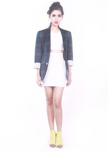 Selanjutnya mini dress berwarna abu-abu ditambah dengan blazer berwarna yang hampir serupa. Ditambah dengan aksesoris kalung yang agak ramai dapat menunjang keindahan dress itu sendiri. Cobalah cari kalung yang cocok dengan dress, jika dress yang simple dapat diberi hiasan kalung. Namun, jika dress dengan motif yang ramai dipakaikan kalung, kalung tersebut tidak akan memperindah dress. Kombinasi seperti ini dapat digunakan untuk menghadiri acara-acara semi formal.