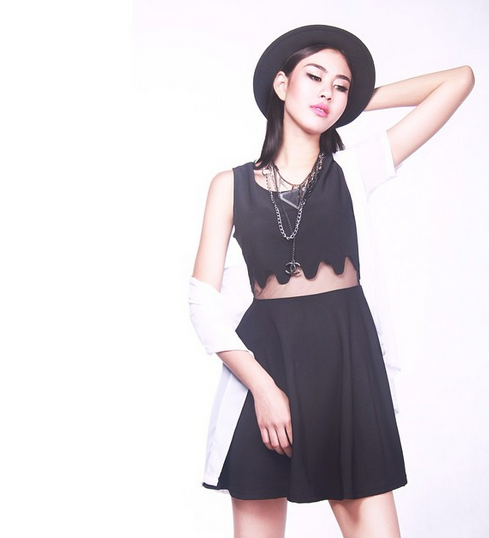 Dress hitam polos dengan bagian transparan ditengahnya dapat mudah dikombinasikan dengan aksesoris dan blazer. Mini dress yang digunakan Shanaz Sadiqah hanya diberi aksesoris kalung dan sentuhan selendang putih. Namun, agar penampilannya tetap modis, Shanaz Sadiqah menambahkan topi hitam berukuran besar. Kombinasi seperti ini dapat digunakan saat hangout bersama teman-teman.