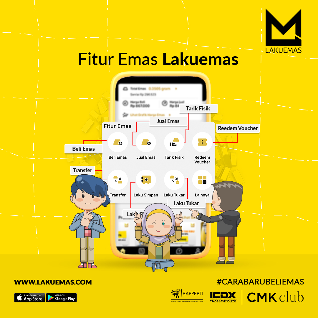 Platform Lakuemas adalah bagian dari Central Mega Kencana (CMK) Group, grup ritel perhiasan emas dan berlian terbesar di Indonesia yang sudah lebih dari 50 tahun berada di Indonesia, yang menaungi brand perhiasan MONDIAL, Frank & co., dan The Palace Jeweler. Lakuemas di-backup oleh 100% emas fisik yang tersedia di kantor pusat Lakuemas (emas logam mulia), bukan trading atau kontrak berjangka. (Far)