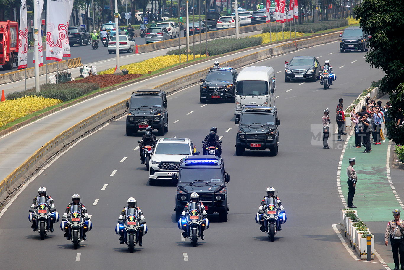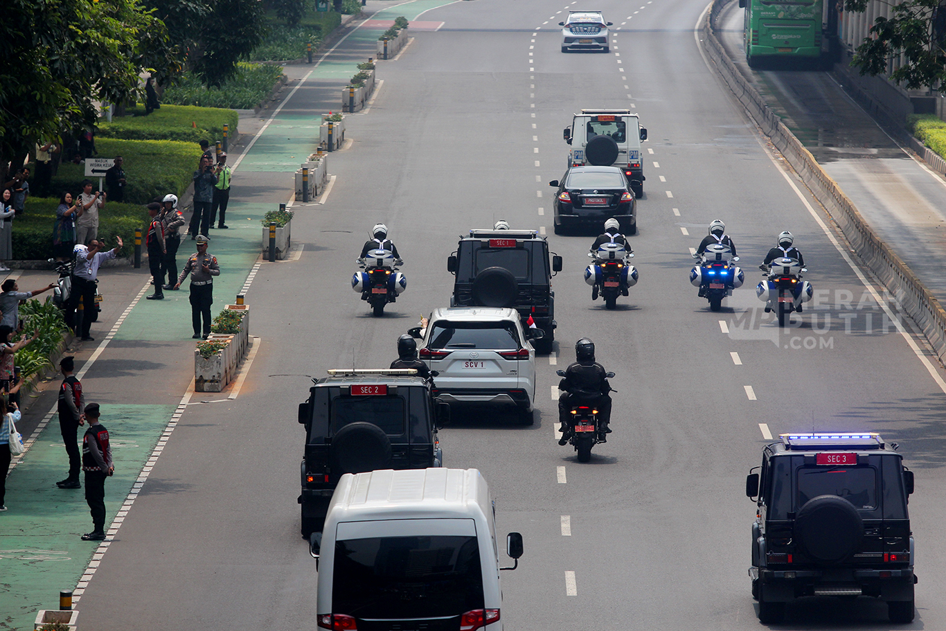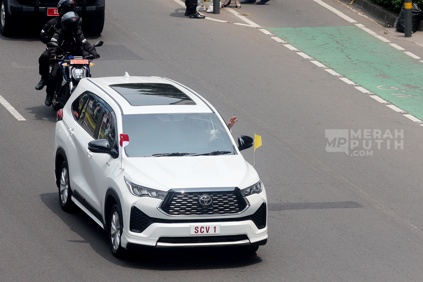 MerahPutih.com - Iring-iringan pengawalan Paspampres mengawal Paus Fransiskus dengan kendaraan Innova Zenix warna Putih nopol SVC 1 saat melintasi Jalan Jenderal Sudirman, Jakarta, Selasa (3/9/2024).