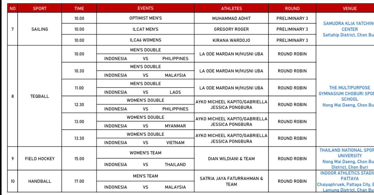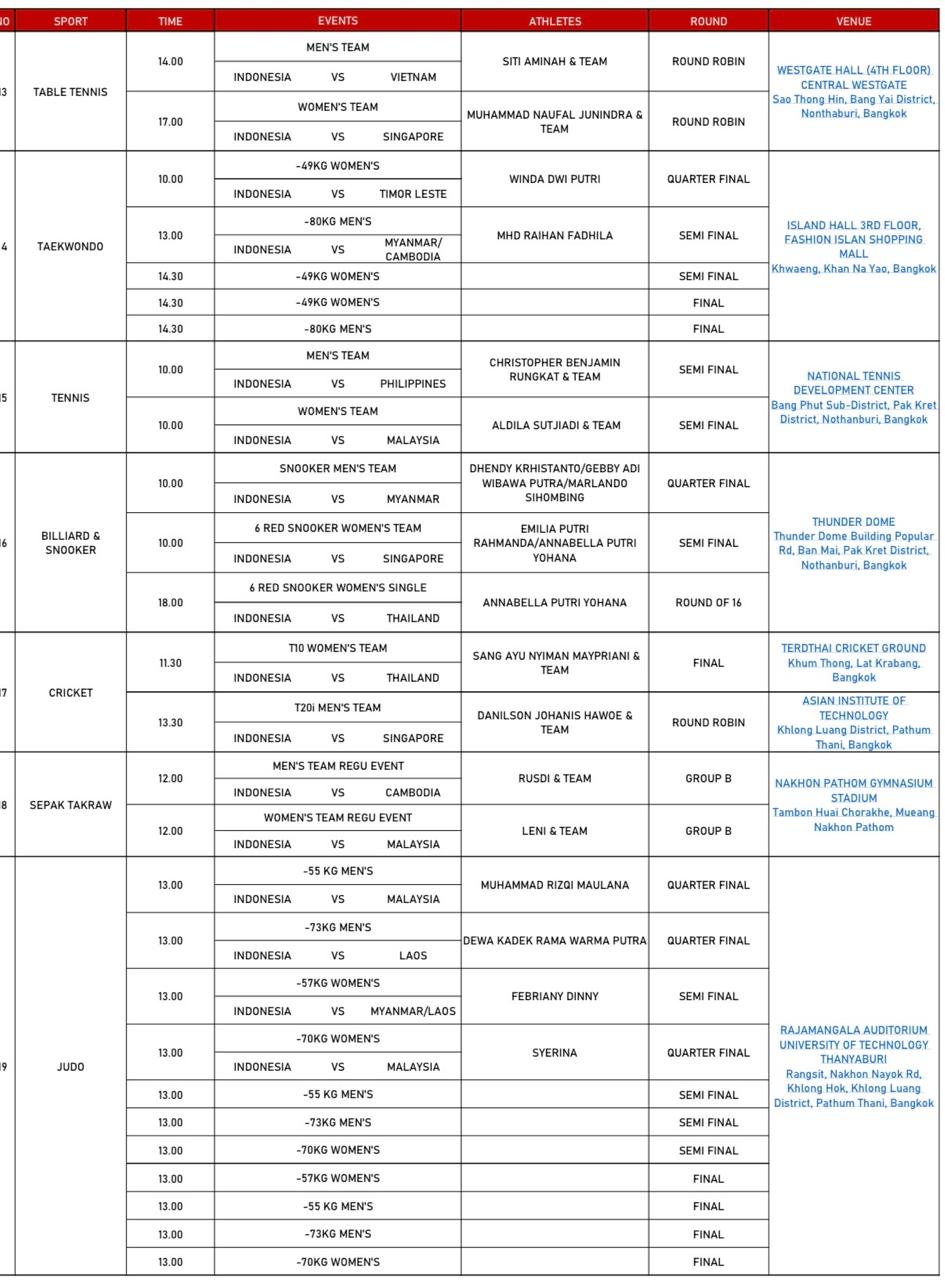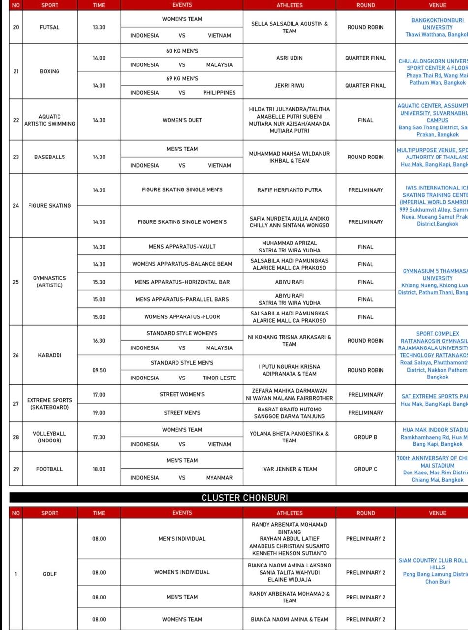 Selain itu, ada laga hidup dan mati Timnas Indonesia U-22 (sepak bola putra) yang akan menghadapi Myanmar di 700th Anniversary Stadium, Chiang Mai, pukul 18.00 WIB.