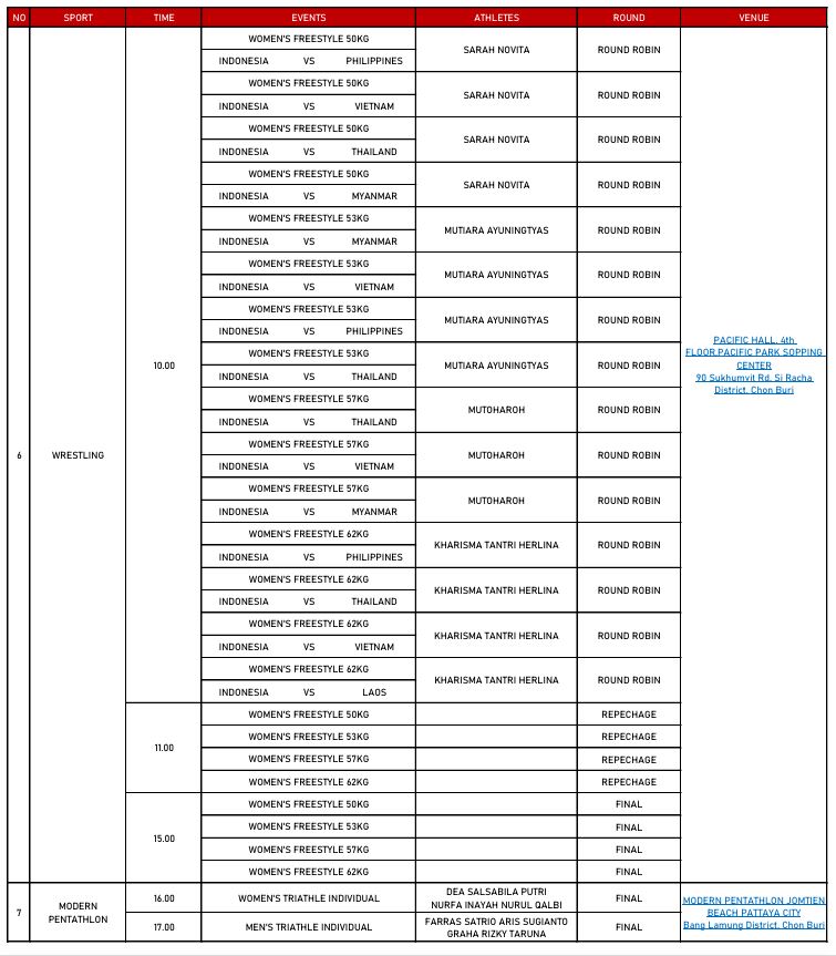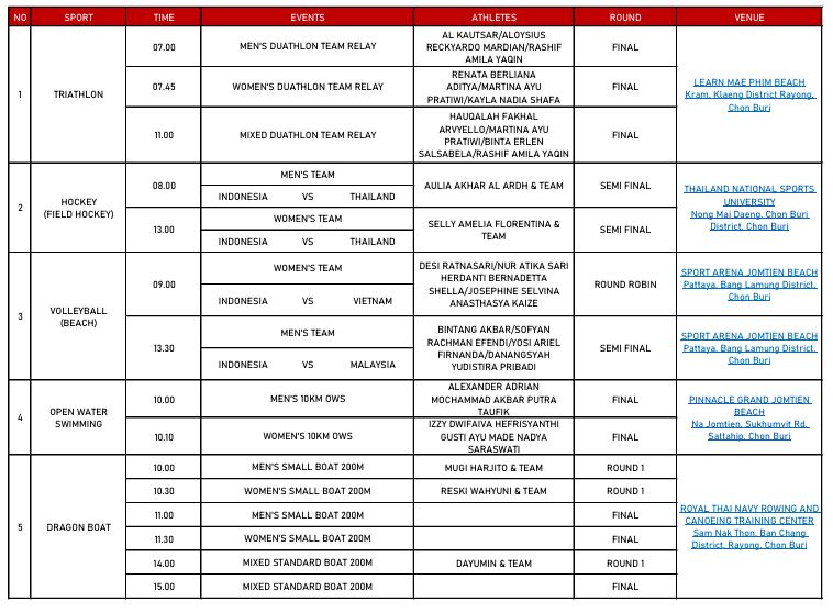 Event paling awal datang dari cabang olahraga (cabor) triathlon pada nomor tim relay putra duathlon, putri, dan campuran, yang dimulai sejak pukul 07.00 hingga 11.00 WIB di Pantai Learn Mae Phim Kram, Chonburi, Thailand.
