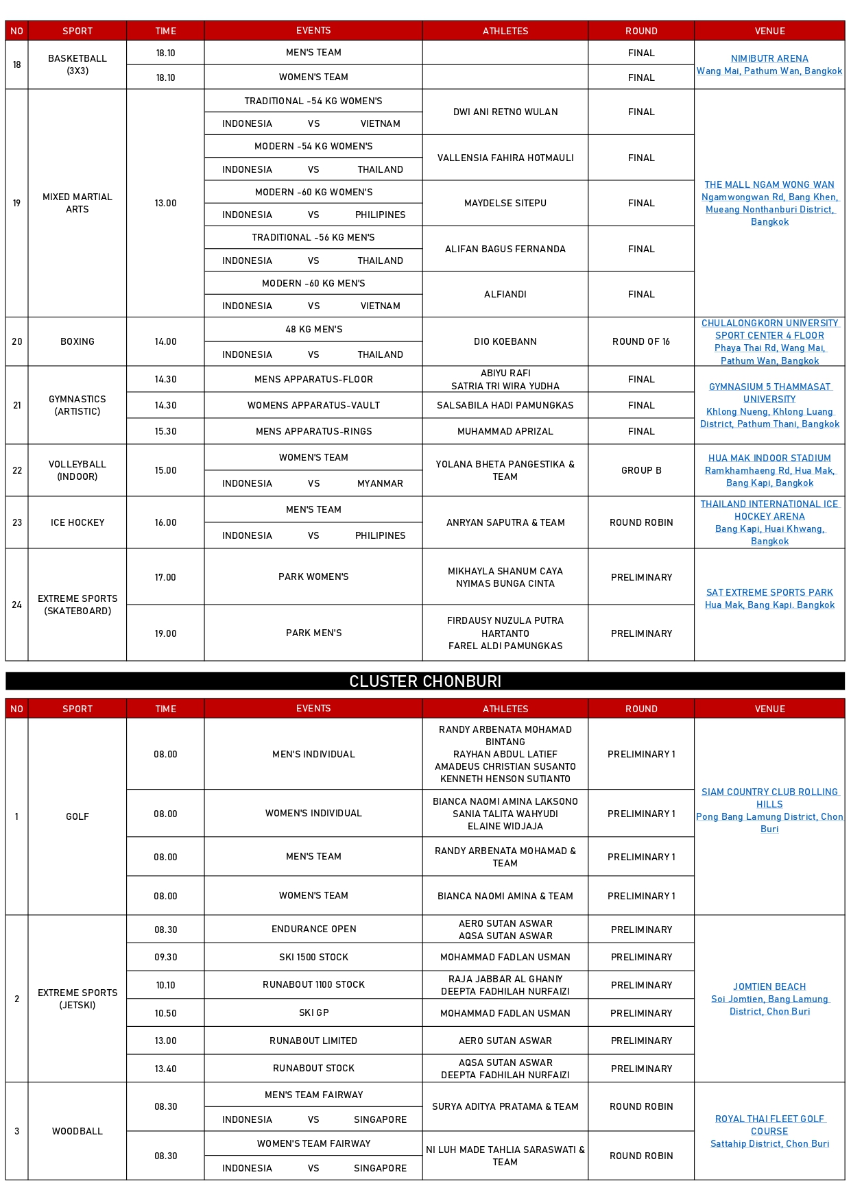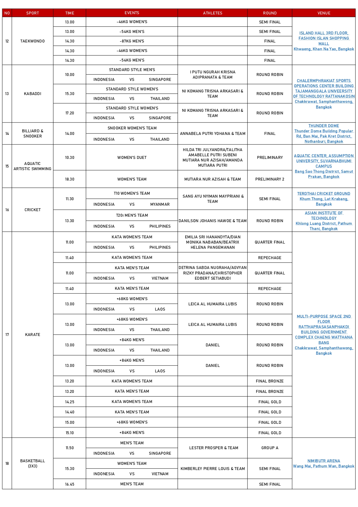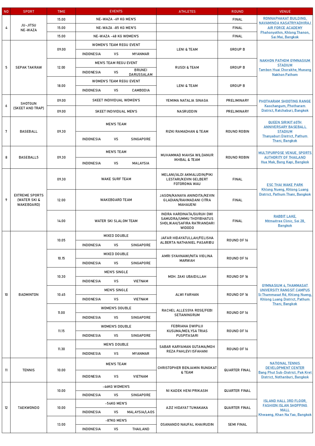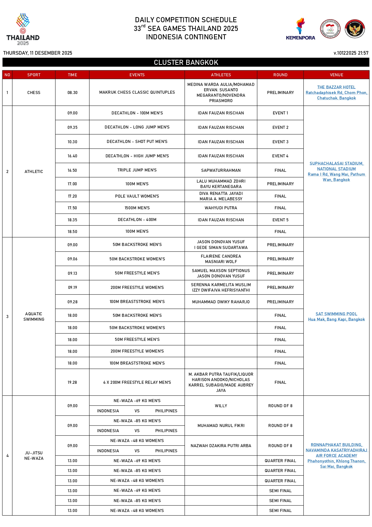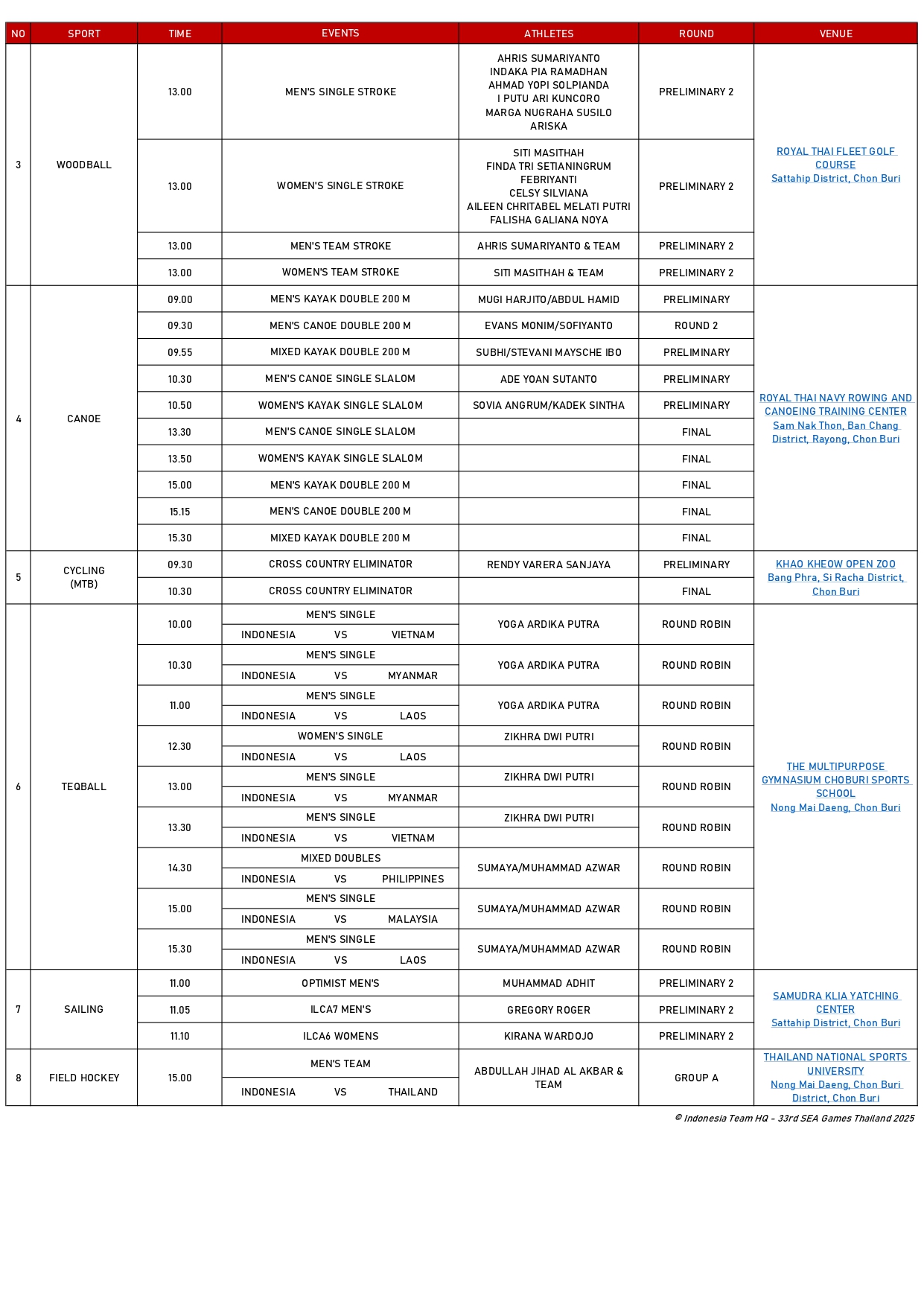 Berikut adalah jadwal lengkap pertandingan Tim Indonesia pada SEA Games 2025 yang digelar hari ini:
