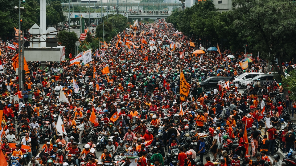 Suasana jalan MH. Thamrin dipadati suporter Persija Jakarta (Jakmania) sejak pagi hari, konvoi kemenangan Persija Jakarta dimulai pukul 08.00 WIB dengan titik kumpul awal Pintu 1 Gelora Bung Karno, Jakarta, Sabtu, (15/12/2018). Konvoi tersebut akan melewati jalan Jendral Sudirman - jalan MH. Thamrin dan berakhir di Balaikota DKI Jakarta. Merahputih.com / Rizki Fitrianto