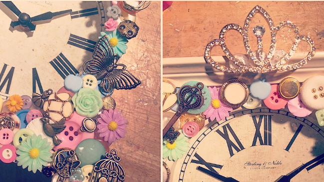 Dengan kancing, ia bisa membuat laptop, kartu nama, jam dinding dan selembar surat jadi lebih cantik. Berikut ini jam dinding yang telah dihiasnya dengan kancing. Tak ketinggalan, ia menambahkan pula ornamen lain. Indah, kan?