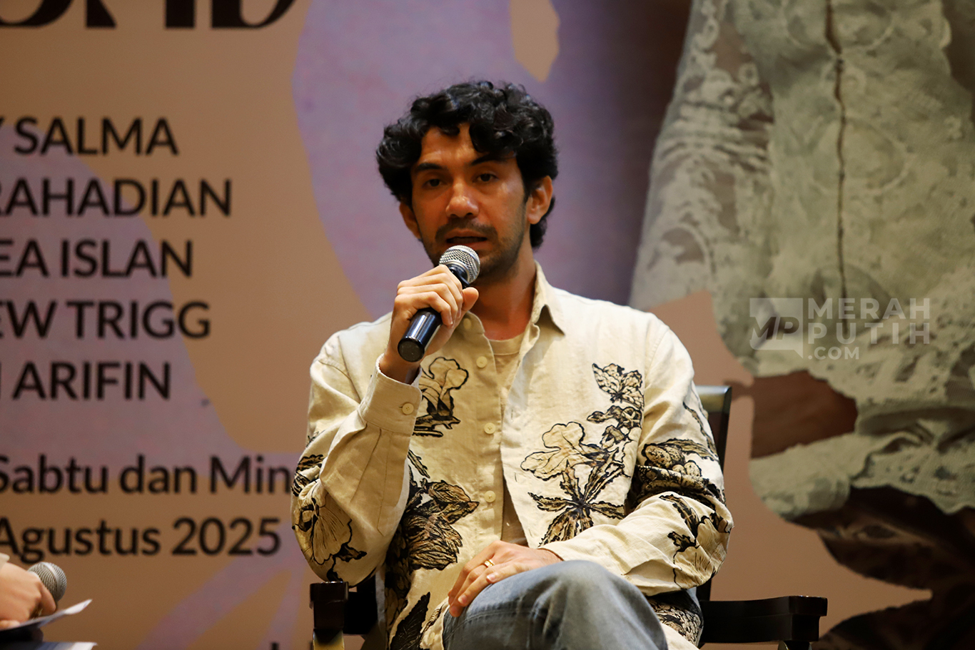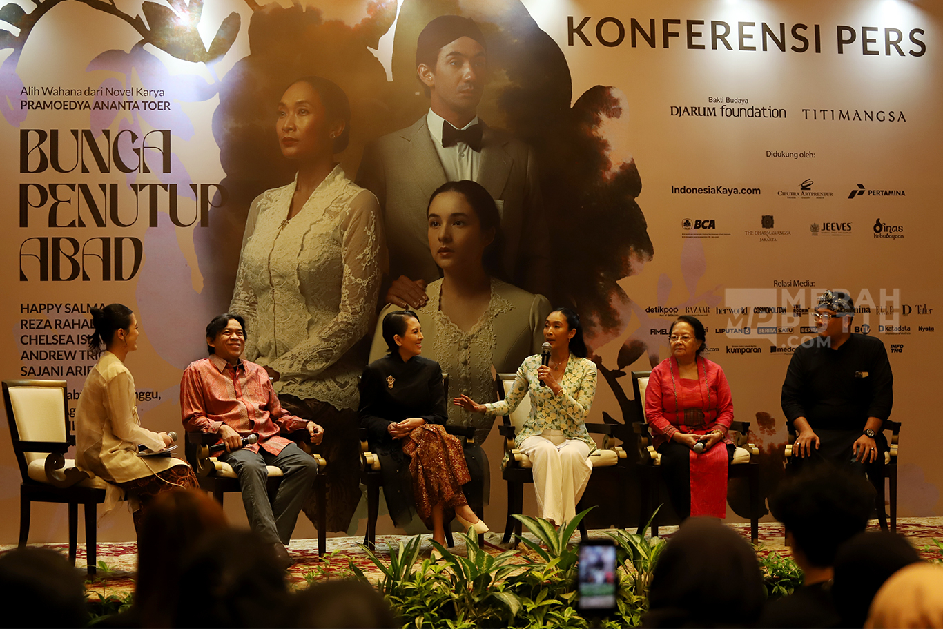 Merahputih.com - Produser sekaligus Pemeran Teater Happy Salma (kedua kanan), Aktris Chelsea Islan (kedua kiri), dan Aktor Reza Rahadian (kiri), Pemeran Teater Sajani Arifin (kanan), memberikan keterangan kepada media jelang pertunjukan teater bertajuk Bunga Penutup Abad di Jakarta, Jumat (15/8/2025).