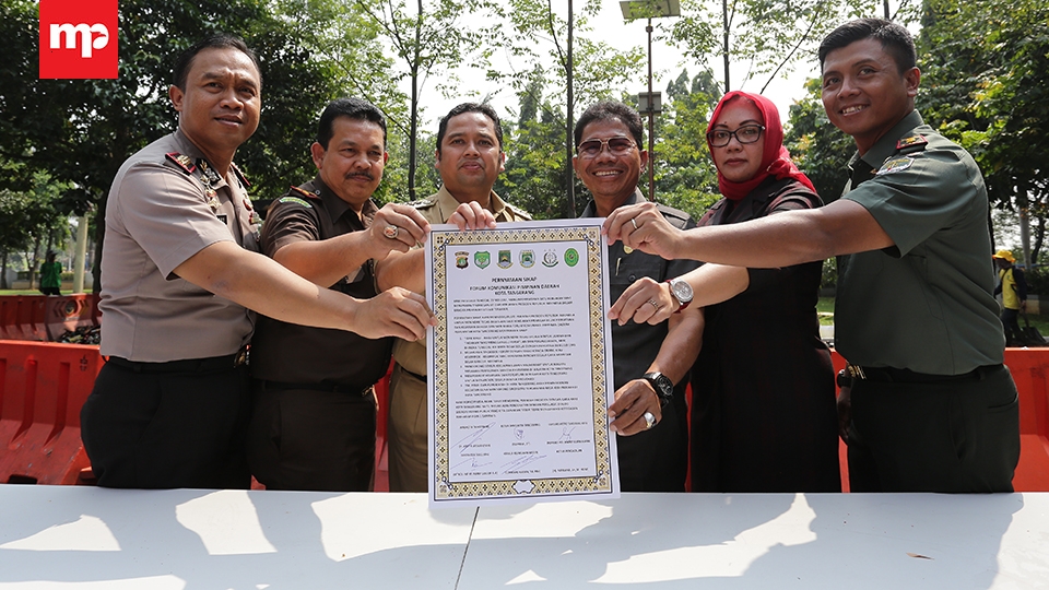Seusai memusnahkan barang bukti miras, (dari kiri ke kanan) Kapolres Metro Tangerang Kota Kombes Pol Harry Kurniawan, Kepala Kejaksaan Negeri Tangerang Edyward Kaban, Walikota Tangerang Arief Wismansyah, Wakil Walikota Tangerang Sahrudin, Ketua DPRD Kota Tangerang Suparmi, dan Dandim 0506 Tangerang Letkol Inf M. Imam Gogor A.A menandatangani penyataan sikap untuk menindak tegas siapa saja yang akan memecah belah persatuan kesatuan bangsa dan NKRI.