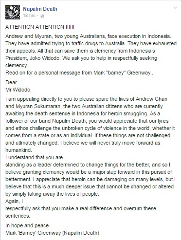 MerahPutih Nasional - Band beraliran grindcore asal inggris, Napalm Death, mengirimkan surat terbuka kepada Presiden Jokowi seraya memohon pengampunan dua terpidana mati yang termasuk kelompok Bali Nine asal Australia: Andrew Chan dan Myuran Sukumaran, lewat akun Facebook resmi Napalm Death, Kamis, 22 Januari 2015.