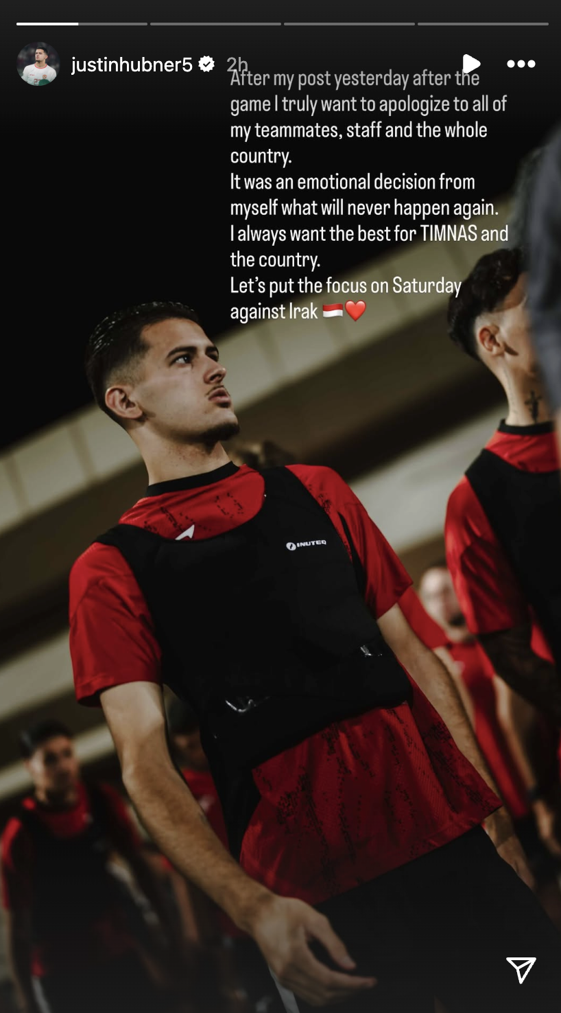 "Setelah unggahan saya kemarin seusai pertandingan, saya benar-benar meminta maaf kepada semua rekan setim, staf, dan seluruh masyarakat Indonesia," tulis Justin di Instagram, Kamis (9/10).