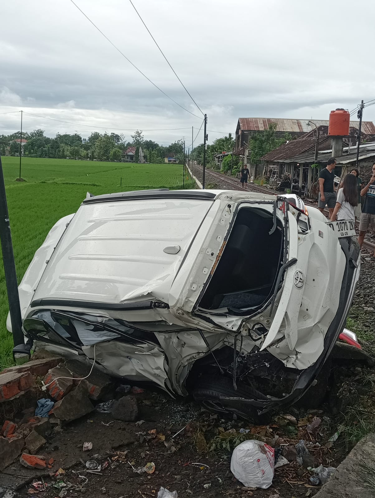 Merahputih.com - KA Batara Kresna relasi Purwosari Solo-Wonogiri tertemper mobil Toyota Rush putih berplat nomor AD 1070 ZK di palang pintu liar Kampung Clangap, Nguter Sukoharjo.