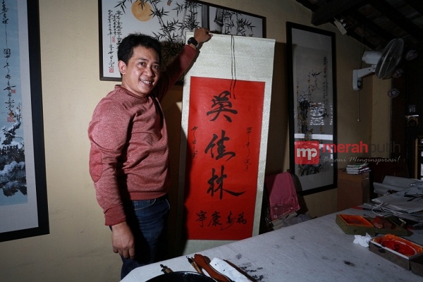 Edy Widianta menunjukkan kaligrafi Cina di perayaan Cun Peh. (Foto: MerahPutih/Rizki Fitrianto)