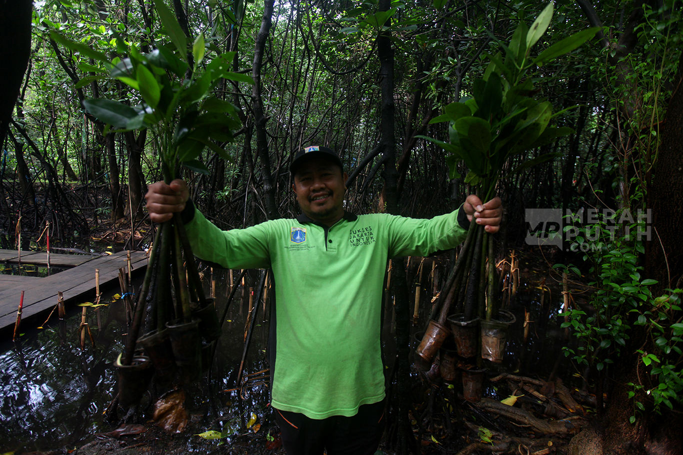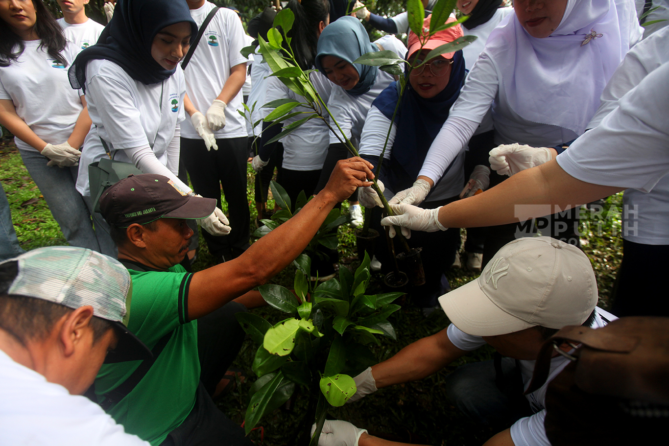 Sebanyak 530 bibit Mangrove yang ditanam diperkirakan mampu menyerap hingga 13,25 ton karbon dioksida per tahun. Penanaman dilakukan di dua titik pesisir, yaitu Muara Gembong, Bekasi, dan Pantai Indah Kapuk, Jakarta, dengan total area tanam mencapai sekitar 530 meter persegi. (MP/Didik Setiawan).