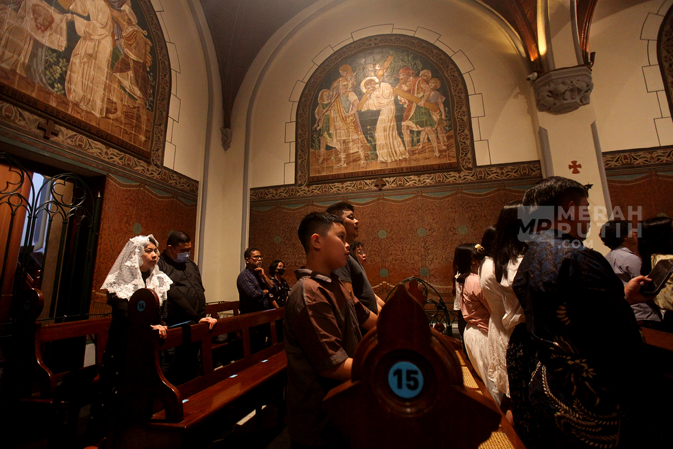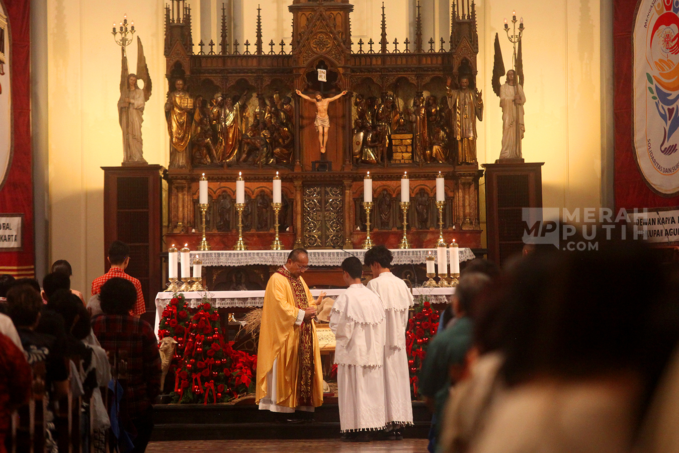 Merahputih.com - Suasana Ibadah Umat Katolik melaksanakan Misa Natal 2024 Gereja Katedral, Jakarta, Rabu (25/12/2024). Gereja Katedral Jakarta menggelar Ibadah Misa Natal 2024. Misa Natal dibagi dalam lima sesi.