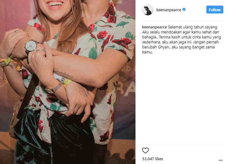 "Selamat ulang tahun sayang. Aku selalu mendoakan agar kamu sehat dan bahagia. Terima kasih untuk cinta kamu yang sederhana, aku akan jaga ini. Jangan pernah berubah Ghyan. Aku sayang banget sama kamu," ujar Keenan dalam unggahan itu.