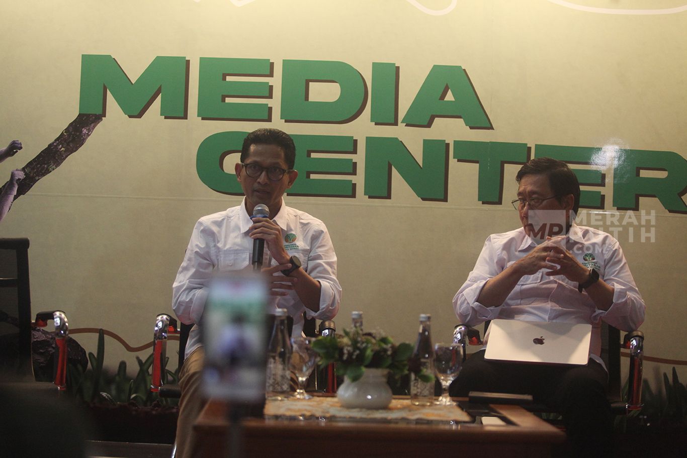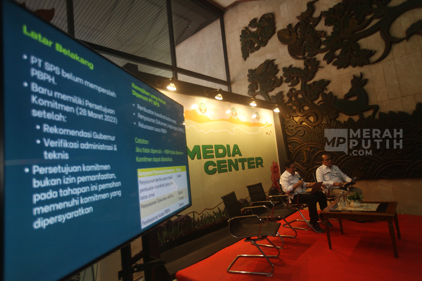 Merahputih.com - (kanan ke kiri) Direktur Penanganan Konflik Tenurial dan Hutan Adat, Julmansyah bersama Sekretaris Direktorat Jenderal Pengelolaan Hutan Lestari, Saparis dan Kepala Biro Humas dan Kerja Sama Luar Negeri, Krisdianto saat pemaparan di Jakarta, Senin (25/8/2025).
